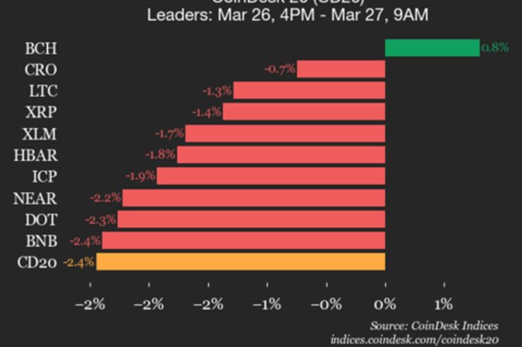 CoinDesk 20 performance update: AAVE drops 3.2% as nearly all constituents decline